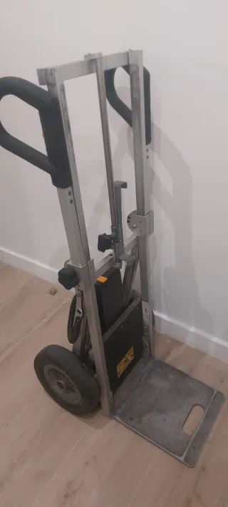Carretilla eléctrica diseñada para subir escaleras, facilitando el transporte de cargas pesadas. - Estructura metálica resistente. - Ruedas neumáticas para mayor agarre. - Asa ergonómica para un manejo cómodo. - Plataforma de carga robusta.