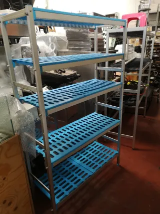 Estantería de cuatro niveles, ideal para cámaras frigoríficas o espacios de almacenamiento. - Estructura metálica. - Bandejas de plástico azul perforadas.