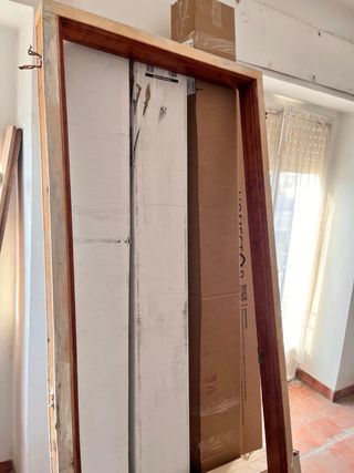 Conjunto de dos puertas de madera maciza con postigo. - Material: Madera. - Diseño con paneles. - Postigo integrado. Medidas: 49*209 Incluye marco original El precio por unidad es de 500 euros.