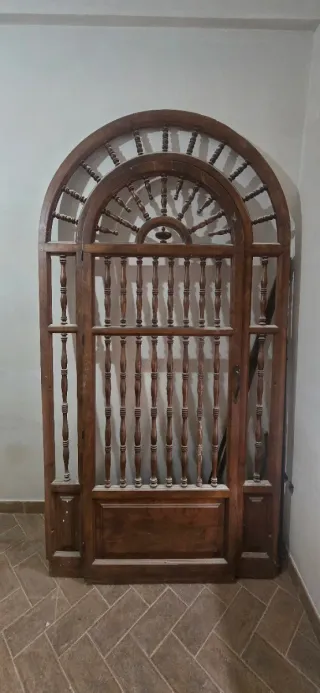 Puerta rústica de madera con diseño de palillería, ideal para recibidores o como elemento decorativo. - Estructura de madera oscura. - Arco superior decorativo. - Diseño de barrotes verticales.