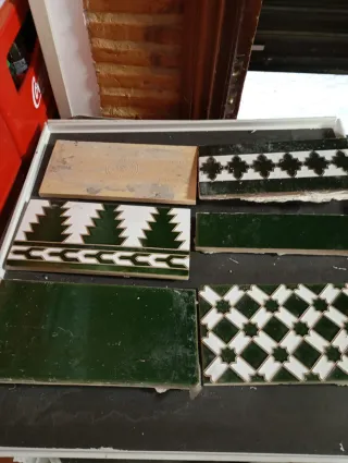 Conjunto de baldosas vintage con un diseño único y un acabado esmaltado. - Baldosa de color rojo vibrante. - Baldosa de color ocre con borde oscuro. - Baldosa de color grisáceo con reflejos - Unas 150 unidades o màs...