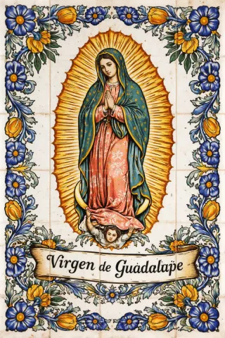 Conjunto de 40 baldosas con diseño de cruz. - Diseño de rombos en tonos tierra y azul. - Borde exterior de baldosas lisas en tono tierra.