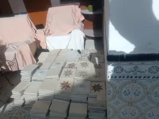 Conjunto de baldosas hidráulicas antiguas con diseños geométricos en buen estado. 12 metros cuadrados aprovechables Tendrán más de 100 años - Baldosa con diseño octogonal y rombos. - Baldosa con diseño de estrella. - Baldosa lisa. * Muestras no selecionadas, escogidas al azar *Precio por metro cuadrado