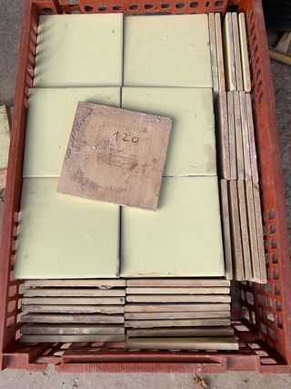azulejos recuperados de cocina años 60. A 0,50euros la unidad. vendo lotes mínimos de 50 unidades. Todos de la misma caja, para evitar moverlos todos cada vez. - Material: Cerámica. - Color: amarillo. - Estilo: Vintage años 60.