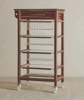 Mueble carrito de cocina de Zara. Con estructura y cajón de madera de acacia y cestas de metal en forma de red con asas de madera. Detalle de balda lateral para colgar textiles o utensilios. El mueble incluye ruedas con freno para facilitar el traslado del mismo y colocarlo de forma segura. El cajón de madera tiene un tope para evitar que se extraigan por completo. las medidas son 89x50x33.50 (hay una foto).
