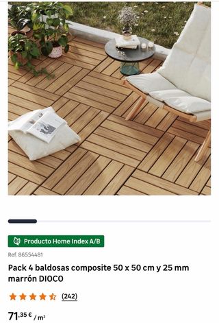 Pack de 4 losetas composite para exterior, modelo DIOCO en color marrón. - Medidas: 50 x 50 cm. - Grosor: 25 mm. - Material: Composite. Cada pack de 4 baldosas corresponde a 1 metro cuadrado. Precio original 71€/m2