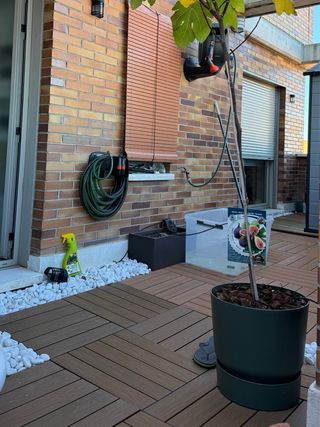 Suelo de terraza compuesto por 18 baldosas de color negro. Son de plástico resistente y fáciles de instalar. Medidas 30x30cm. Ideales para exterior. Se encuentran en buen estado. Compradas en Leroy Merlín.