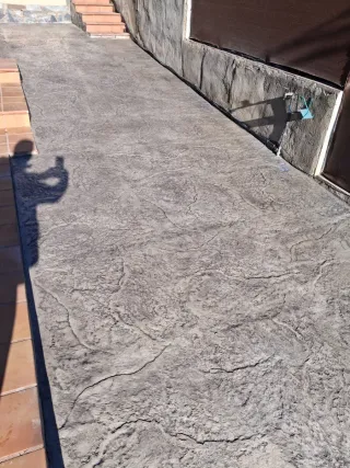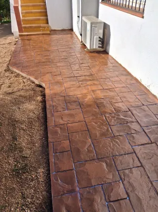 Pavimento de hormigón impreso con acabado imitación piedra en color marrón. Ideal para exteriores. - Diseño de losas irregulares. - Acabado texturizado.