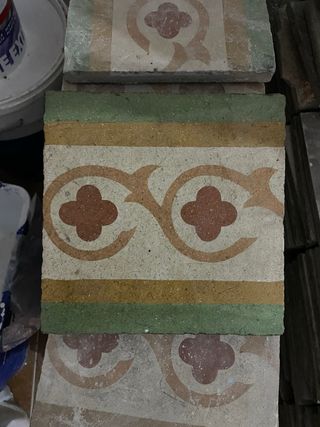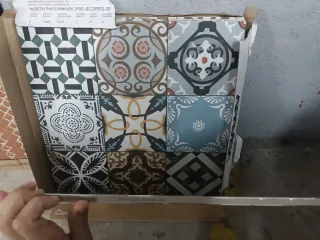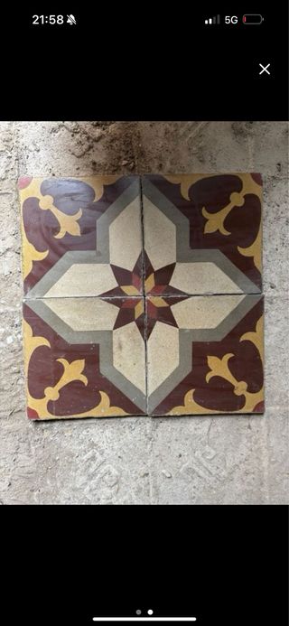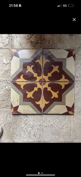 Se vende pavimento hidráulico antiguo en buen estado. Ideal para proyectos de restauración o para dar un toque vintage a tu hogar. - Diseño geométrico. - Tonos tierra y verde. - Piezas cuadradas.