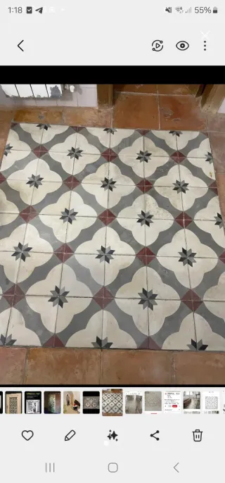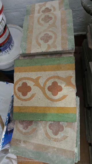 Conjunto de baldosas hidráulicas , están en buen estado,estaban puestas con yeso el cual habría q limpiar para reutilizarlas. Se vende todo el piso completo.