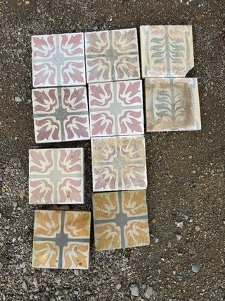 Conjunto de baldosas hidráulicas antiguas con variedad de diseños, florales y geométricos. - Diseño floral en tonos rosas y grises. - Diseño de árbol en tonos verdes y beige. - Diseño floral en tonos ocres y pastel 300 unidades , variedad de diseño Medida : 20x20cm Están para limpiar el mortero antiguo, son recuperadas de una casa. Se venden por unidad o lote . Hay que venir a recogerlas , no se hacen envíos. Para mas info preguntar.