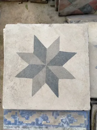 Conjunto de baldosas hidráulicas antiguas con diseños geométricos en buen estado. 12 metros cuadrados aprovechables. Tendrán más de 100 años - Baldosa con diseño octogonal y rombos. - Baldosa con diseño de estrella. - Baldosa lisa. * Muestras no selecionadas, escogidas al azar *Precio por metro cuadrado