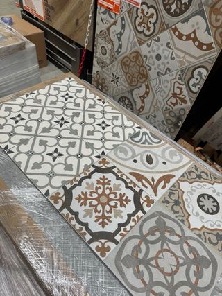 Conjunto de azulejos con un diseño inspirado en el estilo hidráulico, perfectos para dar un toque especial a tu cocina o lavabo. Cada azulejo presenta un patrón geométrico y floral único. - Diseño: Estilo hidráulico - Uso: Cocina, lavabo - Acabado: Vidriado - Material: Cerámica Son 9 azulejos juntos formando un panel de 60x 60 como se ve en la foto. Tengo 5 paneles completos más retales
