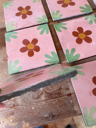 Lote de baldosas hidráulicas antiguas con un diseño floral en tonos verdes y rosados. Perfectas para dar un toque vintage a cualquier espacio. 2,5€ unidad. 8,5m2 aproximadamente - Diseño floral. - Tonos verdes y rosados. - Material: Hidráulico.