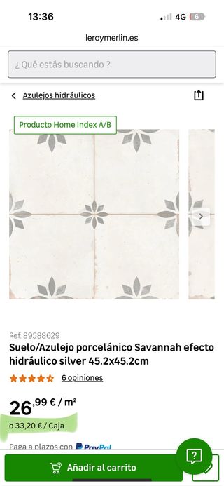 Azulejo porcelánico con efecto hidráulico, modelo Savannah. - Acabado: Silver. - Medidas: 45.2x45.2 cm. - Referencia: 89588629. tengo 2 cajas = 10 unidades (cada unidad tiene cuatro azulejos) El precio en tienda por caja es de 33.30€. O sea dos cajas serían 66,60 €. Vendo las dos cajas por 30 €