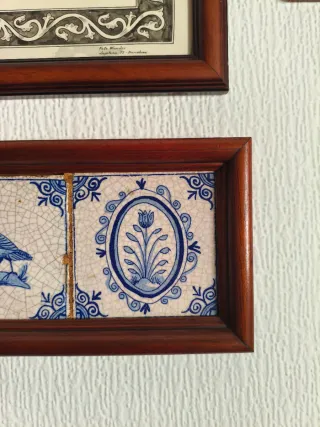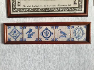 Conjunto de cinco baldosas cerámicas con motivos decorativos en azul y blanco. Cada baldosa presenta un diseño diferente, incluyendo un jarrón con flores, un pájaro y un diseño floral. Incluye marco de madera.
