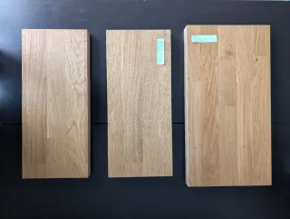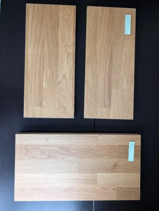 Conjunto de tres baldas o listones de madera. Canteadas por los 4 lados excepto por la parte baja. Son muy bonitas, pero nunca las hemos podido usar. Preparadas para usarlas en zonas húmedas si se desea - Material: Madera. - Cantidad: 3 unidades. - Nunca se han usado Medidas: - Balda grande: 47.5 x 25 cm x 3,5 espesor - Baldas pequeñas: 43 x 19 cm x 3.5 espesor