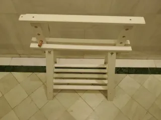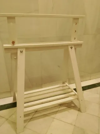 Precio unidad 20€. Si compras los 2 y necesitas trasporte,te los llevo x 5€. Conjunto de dos caballetes de madera con una balda cada uno. Son ideales para crear un espacio de trabajo o exposición. - Estructura de madera pintada en blanco. - Balda de madera. - Diseño sencillo y funcional.