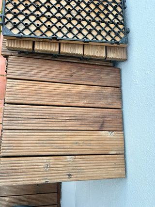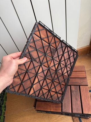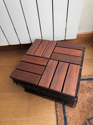 Baldosas de madera para exterior, ideales para terrazas o balcones. Son fáciles de instalar y dan un toque natural a cualquier espacio. pack de 10 unidades 0.9m² Tengo 2 packs 25e cada pack - Material: Madera. - Diseño: Mosaico de lamas.