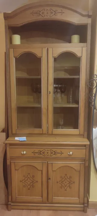 Mueble de madera con un diseño clásico y elegante. - Puertas con detalles tallados. - Cajones con tiradores dorados. - Acabado en madera claros. Con dos baldas de madera