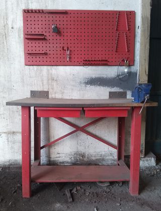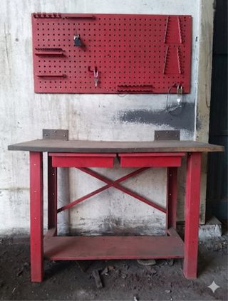 Conjunto de mesa de trabajo y panel organizador a juego. La mesa cuenta con estructura metálica (color rojo), encimera de madera resistente, 2 cajones para guardar material y balda inferior de gran capacidad. Incluye el panel de pared metálico perforado con varios soportes para llaves y herramientas ya instalados. Ideal para garaje, mecánica o zona de bricolaje. Se vende por liquidación de taller.