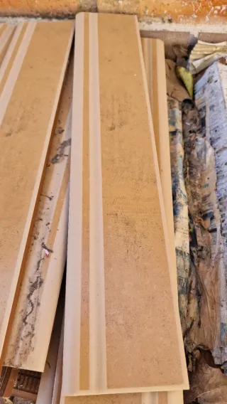 Rodapiés de color beige con un diseño de 40,5x8. - Color: Beige - Medidas: 40,5x8 Tres cajas de rodapies, un total de unos 90 rodapies, nuevos, en lo que queda de sus cajas. Comprados por un cierre de fabrica y no usados por no coincidir con mis necesidades a la hora de realizar la obra