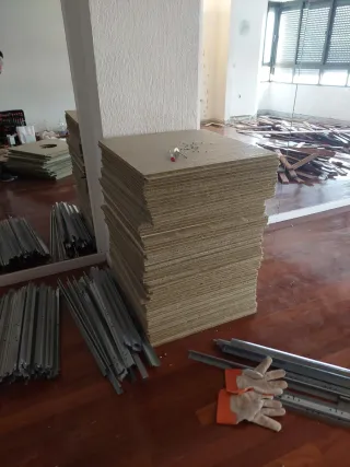 Se venden placas acusticas basicas para techo desmontable, con medidas de 59x59cm x1,2cm Hay material para cubrir aproximadamente 30 metros cuadrados. ( 66 placas enteras y aprox 20 parciales). Incluye guías y 4 focos de unos 20cm aprox - Medidas: 59x59cm - Cantidad aproximada: 30m2