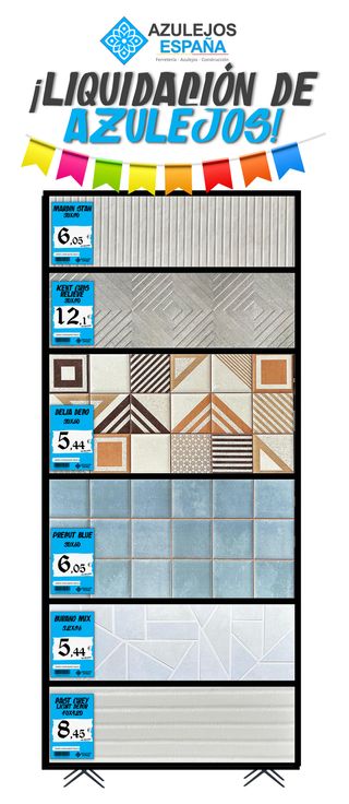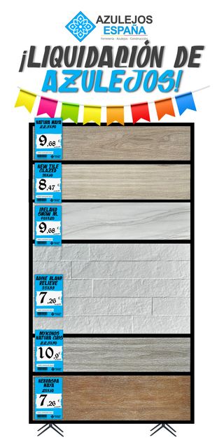 Liquidación de azulejos de diferentes modelos y acabados. ¡Aprovecha esta oportunidad! - Natura Haya 22.5x90: 9,68 € - New Tile Glazed 30x60: 8,47 € - Ideland Show M. 40x120: 9,68 € - Adine Bland Relieve 33x55: 7,26 € - Mykonos Natura Gris 22.5x90: 10,99 € - Nebrasda Haya 20x60: 7,26 € y muchos más en stock
