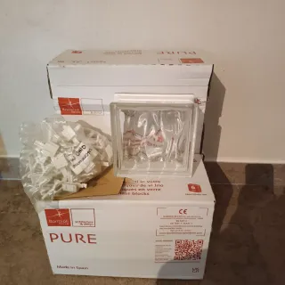 Se venden bloques de vidrio Bormioli Rocco, modelo PURE, para construcción. - Marca: Bormioli Rocco - Modelo: PURE - Material: Vidrio - Dimensiones: 190x190x80 mm - Clase: EN 1051-1 CLASS 1 - Fabricado en España Con kit de 20 grapas para su montaje
