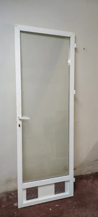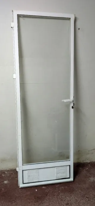 PUERTA ALUMINIO SIN MARCO CON CRISTAL CLIMALIT ALTA CALIDAD Y EN PERFECTO ESTADO MEDIDAS: 203,5 alto x 70,5 cm ancho y 4 grosor *REGALO cortina Por cambio a PVC vendo puerta de ALTA GAMA (procede cocina reformada) en perfecto estado, con perfileria extrusionada lacada al horno, 2 tiradores, cerradura seguridad + llave, marco aluminio blanco y cristal climalit alta calidad. Además tiene un panel inferior con 2 rejillas ventilación y burlete por todo el marco protector frio, viento y ruido Palabras clave ganga chollo barato cenefa azulejos baño azulejo alicatado embaldosado colocación parquet baldosas servicio albañil urge reforma