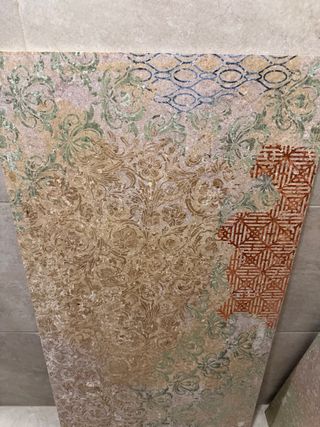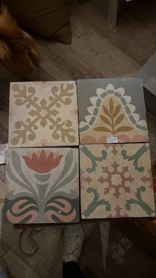 Conjunto de 8 baldosas decorativas de estilo artesanal. (Hay una que estoy usando) Cada baldosa presenta un diseño único y colorido. El precio por unidad es de 10€ Sino todo junto 50€ - Diseños florales y geométricos. - Tonos tierra, rosa, verde y gris. - Acabado mate. Talla 20/20 cm Perfecto para exponer joyeria en una tienda como lo hacia yo A retirar en mi tienda del barrio gotico