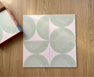 1 caja (12 baldosas)= 18€ 2 cajas= 30€ Me han sobrado dos cajas de baldosas autoadhesivas. Son fáciles de colocar y resistentes (usadas pra pavimento de un baño). Tienen un dibujo muy bonito, con efecto vintage que le da mucho realismo. Las cajas están algo arrugadas (ver fotos), pero las baldosas estan bien. - Diseño de semicírculos. - Tamaño: 20x20 cm.