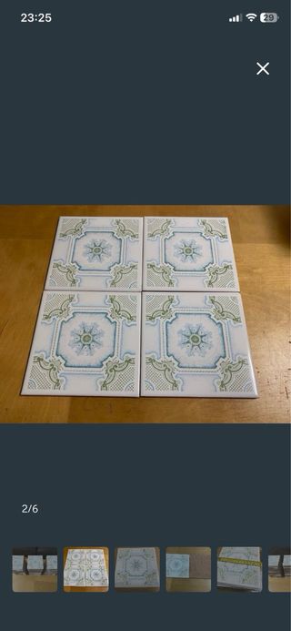 Conjunto de seis baldosas antiguas con un diseño floral en tonos azules y verdes. - Medidas: 15x15 cm. - Diseño ornamental con detalles en relieve.