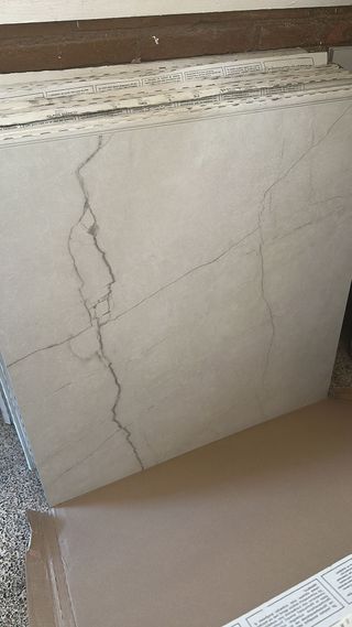 Gres porcelanico, mate, rectificado, de gama alta, fabricada en Italia. 4 piezas perfectas + 1 pieza tiene una esquina picada. Necesita transporte profesional (min. 2 personas), son muy grandes y PESAN MUCHO. Para ver todos los detalles en la pagina web de fabricante, busca por "atlas concorde dwell off white mate 120x120" Precio original 95€/m^2