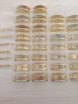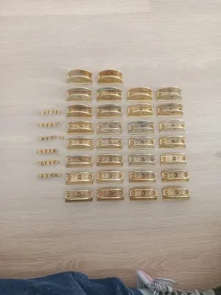 Lote de 30 soportes para baldas en color dorado y 30 tornillos para ajustar y proteger la balda. Solo 2 de ellos no tienen el plástico pequeño. Son ideales para estanterías. Usados, pero en buen estado. - Material: Metal dorado. - Diseño curvo. - Incluye tornillos.