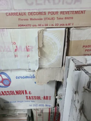 Caja de baldosas cerámicas de varios colores y tamaños. Ideales para proyectos de bricolaje o reformas. - Peso aproximado: 80 kg - Variedad de colores y tamaños - En perfecto estado