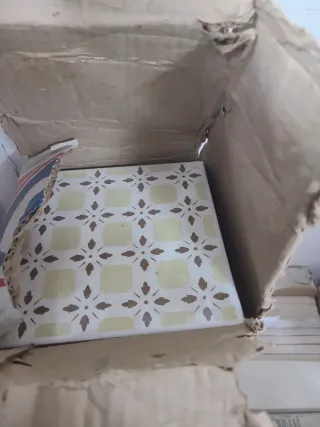Cerámica, pasta blanca. Estilo vintage. Lo que se ve en las fotos es suciedad. Están nuevas. Tengo 17. Tengo 17 baldosas, no cajas, si te llevas más de 10 a 0,5 la unidad. Menos de 10 a 1 euro.