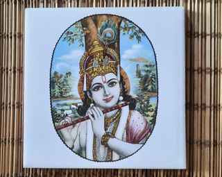 Azulejo con la imagen impresa del dios hindú Krishna tocando la flauta de bambú, el bansuri. Simboliza la llamada al amor incondicional con la música cósmica que cautiva al alma y la alegría. Krishna viste plumas de pavo real en un marco ovalado y escena con fondo de paisaje y animales. Pieza devocional, decorativa y coleccionismo. Medidas: 10,8 x 10,8