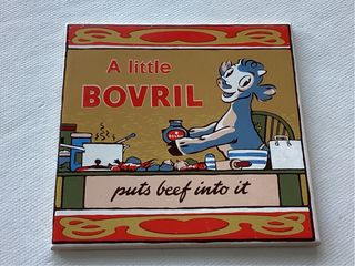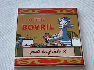 Este azulejo vintage presenta un anuncio clásico de Bovril. - Diseño retro con ilustración. - Texto: A little BOVRIL puts beef into it.
