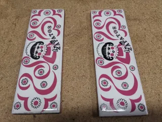 Conjunto de dos azulejos decorativos con un diseño vintage, años 70 - Diseño con figura de niña y flores. Medidas 15x5 - Texto ZAPATOS en cada azulejo.para caja de limpieza de calzado de la época - Colores rosa y blanco.