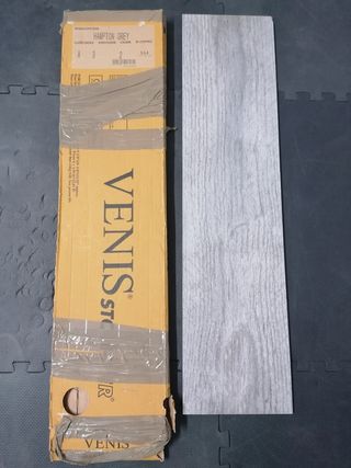 Suelo porcelánico rectificado de Porcelanosa Venís Hampton Grey de 22x90 cm. Dispongo de una caja y una plaquetas suelta.