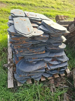 Lote de pizarras naturales, ideales para tejados o proyectos de construcción. - Material: Pizarra. - Color: Gris oscuro con toques rojizos. - Forma: Ovalada/redondeada. - Uso: Cubierta de tejados, revestimientos.