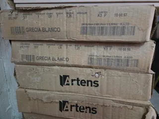 13 cajas de azulejos de gres porcelánico de la marca Artens. Modelo: Grecia Blanco. Dimensiones: 30cm x 60cm x 8,00mm. Metros cuadrados por caja: 1,26 \(\text{m}^{2}\). Piezas por caja: 7. Marca: Artens, fabricada por Outblock para Leroy Merlin