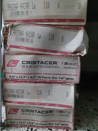 6 Cajas de revestimiento cerámico de la marca Cristacer. - Modelo: 25 X 40 REVESTIMIENTO - Tecnología: INKJET - Grupo: B III - Medidas: 9,8 x 15,7 x 0,4 - Contenido: 10 Piezas (aprox. 1 m²) caja.