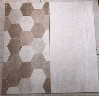 Lote de 98 azulejos de la marca Mykonos en tonos beige y crema mate. 30x60 cms. Presentan un diseño hexagonal combinado con un acabado liso. - Diseño hexagonal 40 azulejos del modelo DECOR TAUPÉ - Acabado liso 58 azulejos del modelo TURÍN CREMA (4 de ellos con esquinas rotas pero aprovechables para cortar) Cada 10 azulejos da para 1.8 m2 Sólo recogida en Vigo.