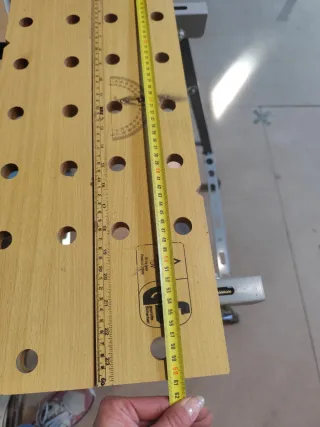 Bancada de trabajo plegable con superficie de madera y soportes. - Superficie con múltiples orificios. - Escala y transportador integrados. - Soportes de sujeción incluidos. - Patas plegables para fácil almacenamiento.