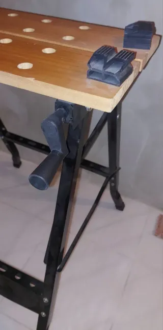 Banco de trabajo versátil y fácil de montar. Ideal para proyectos en casa o en el taller. - Superficie de madera resistente. - Patas metálicas plegables para un fácil almacenamiento. - Incluye accesorios de sujeción. Negociable