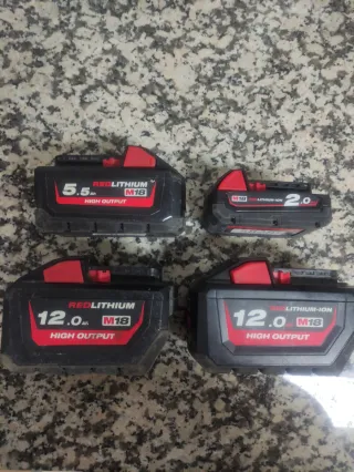 Se vende lote de cuatro baterías Milwaukee M18 RedLithium. ( Ojo Para reparar no funcionan las dos baterías de 12 ah parpadea la luz roja) - Batería de 5.5 Ah. - Batería de 2.0 Ah. - Dos baterías de 12.0 Ah.