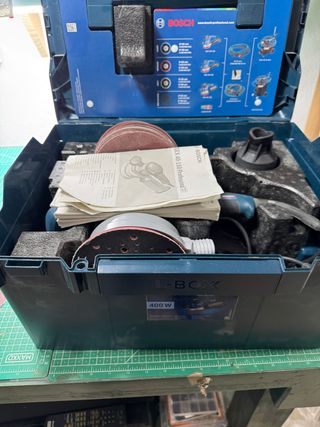 Lijadora rotorbital Bosch Professional GEX 40-150. - Incluye maletín L-BOXX. - Potencia de 400 W. - Disco de lijado de 150 mm.