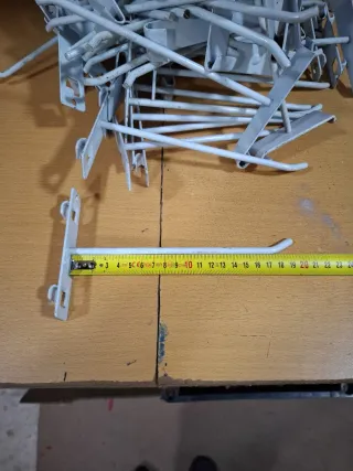 Conjunto de 120 ganchos metálicos de expositor de malla,compuesto por 33 ganchos de 30cms y 7 de 15cms Plata y 80 ganchos blancosde 30cm.Precio del lote - Material: Metal. - Color: Plateado y blanco.